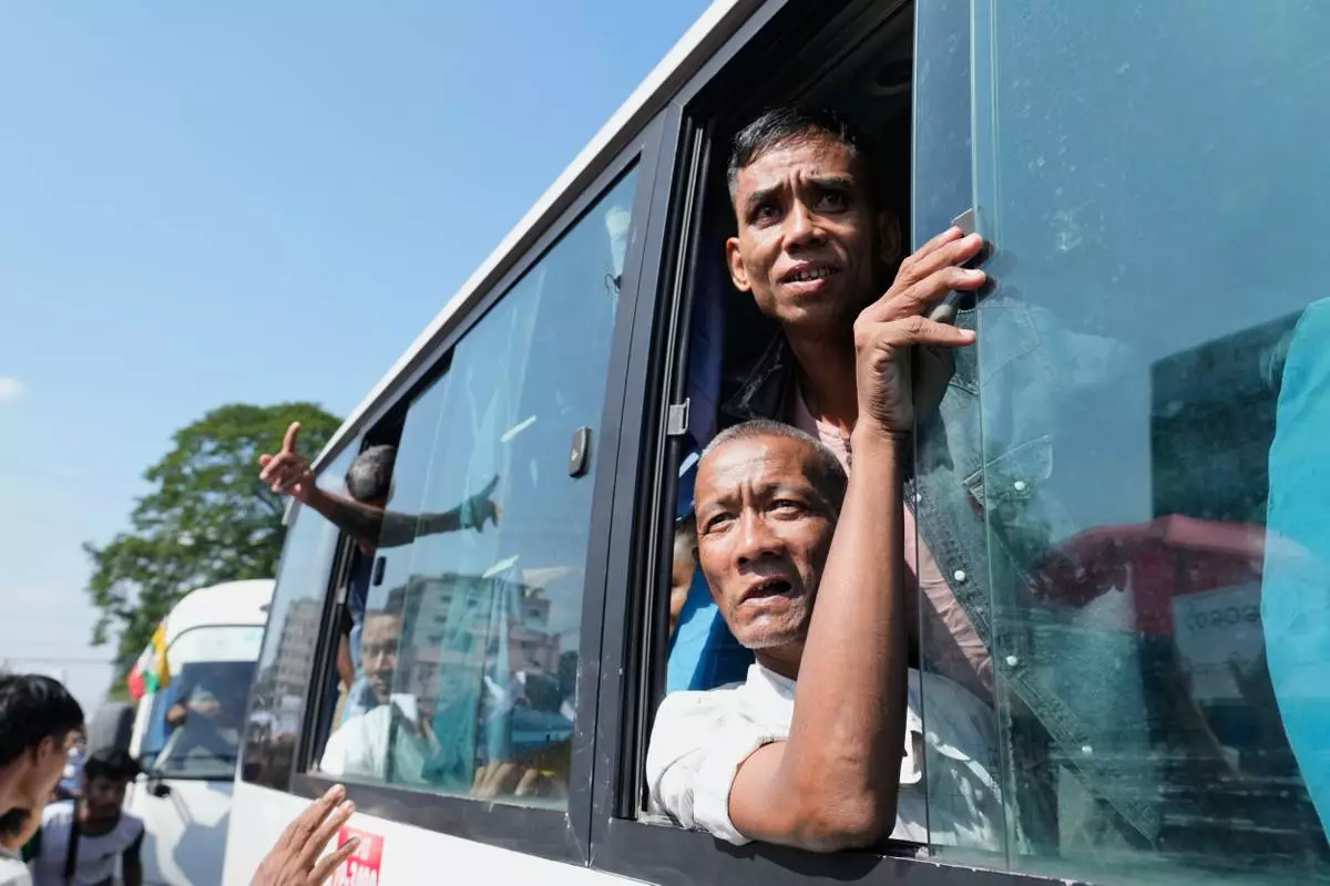 Released prisoners, in a bus, are welcomed by family members and colleagues after they left Insein Prison Sunday, Jan. 4, 2026, in Yangon, Myanmar. (AP Photo/Thein Zaw)