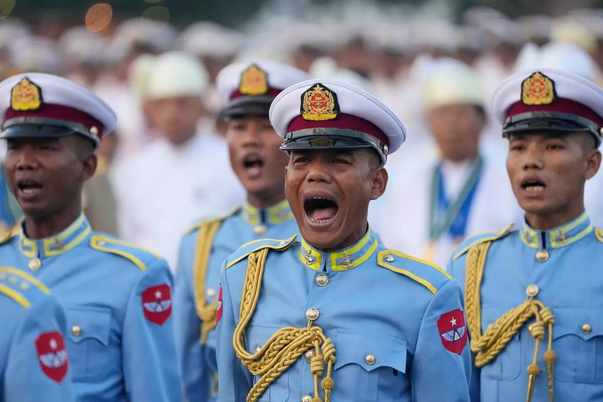 High-ranking soldiers shout commands during a ceremony marking the 78th anniversary of its Independence Day in Naypyitaw, Myanmar, Sunday, Jan. 4, 2026. (AP Photo/Aung Shine Oo)