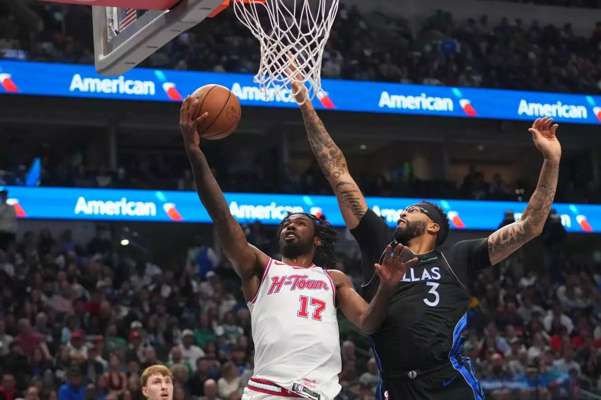 Houston Rockets forward Tari Eason (17) goes up for a basket against Dallas Mavericks forward Anthony Davis (3) during the first half of an NBA basketball game Saturday, Jan. 3, 2026, in Dallas. (AP Photo/Julio Cortez)