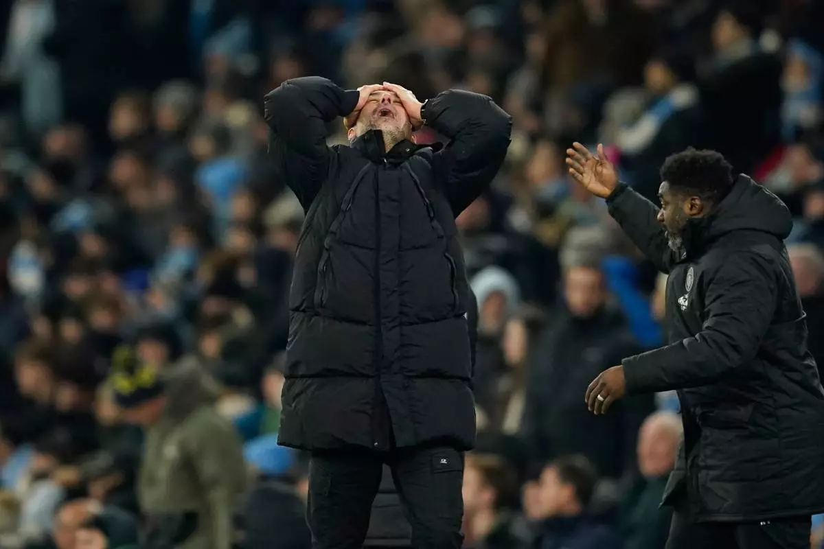 Manchester City's head coach Pep Guardiola, center, reacts after Chelsea's Enzo Fernandez scoring during the English Premier League soccer match between Manchester City and Chelsea in Manchester, England, Sunday, Jan. 4, 2026. (AP Photo/Dave Thompson)