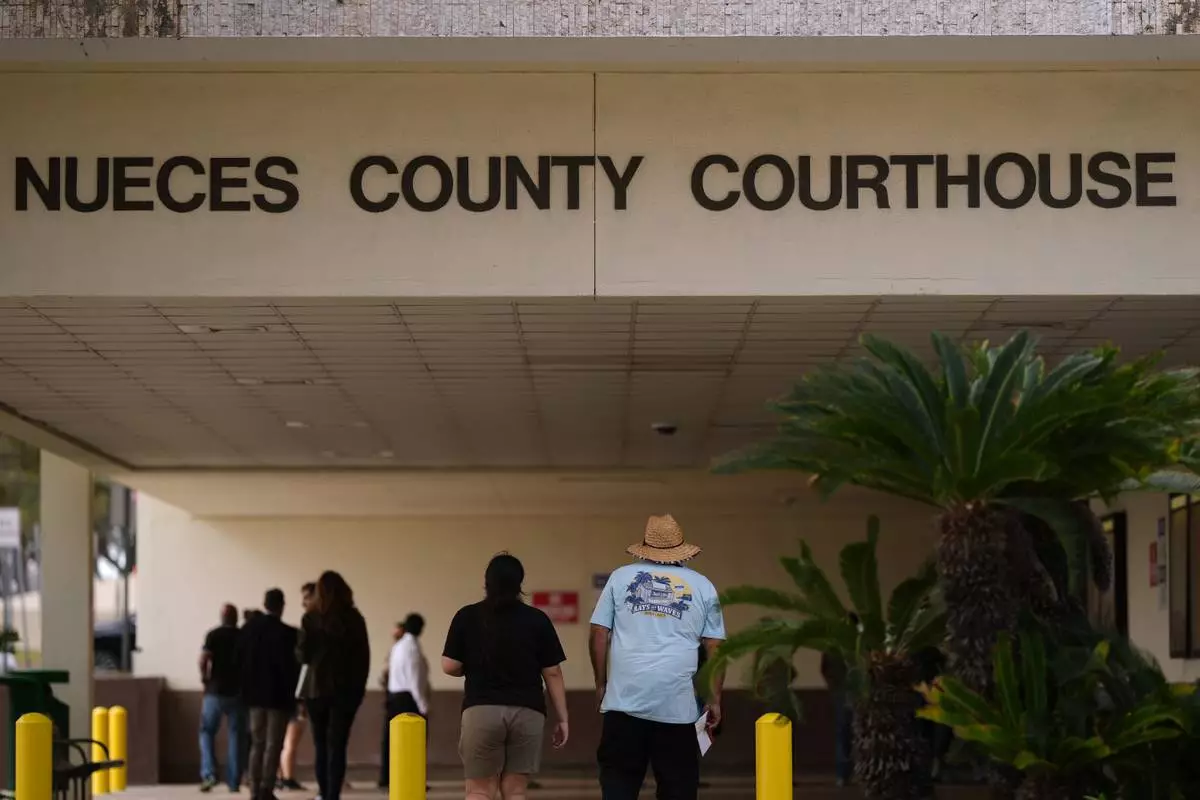 People enter the Nueces County Courthouse in Corpus Christi, Texas, as jury selection continues in the trial for former Uvalde school district police officer Adrian Gonzales, Monday, Jan. 5, 2026. (AP Photo/Eric Gay)