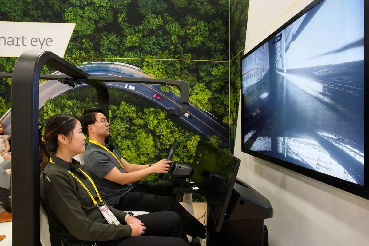 People take part in a simulator for Smart Eye interior sensing AI technology at the Smart Eye booth during the CES tech show Tuesday, Jan. 6, 2026, in Las Vegas. (AP Photo/John Locher)