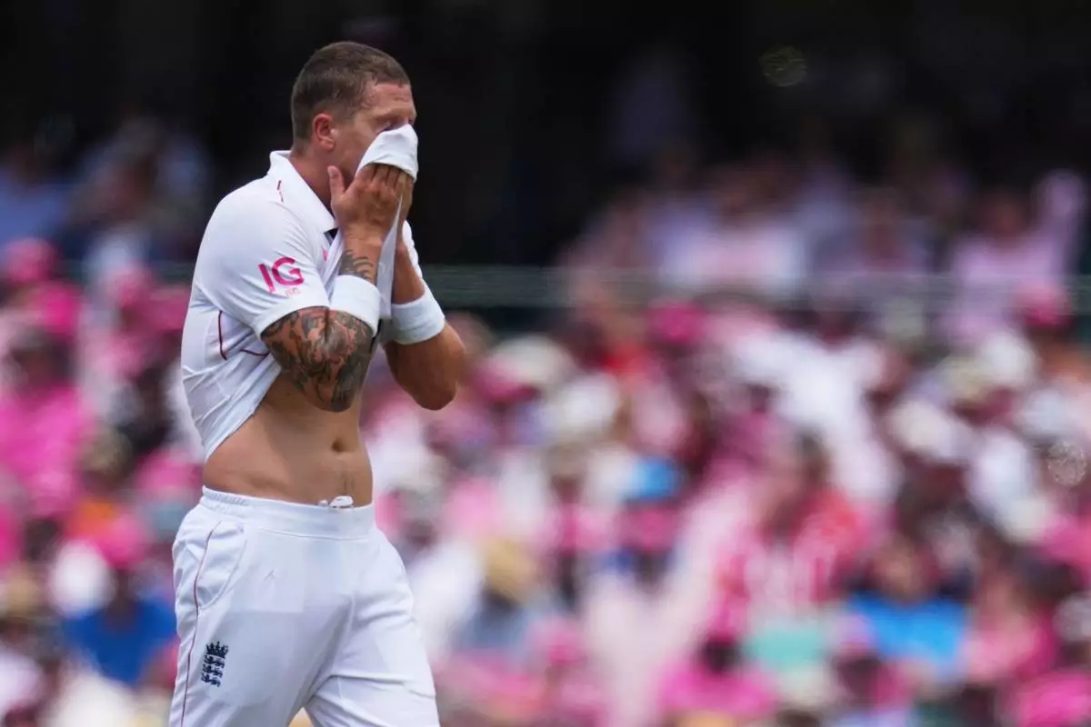 England's Brydon Carse reacts after having a video review denied by the third umpire during play on day three of the fifth and final Ashes cricket test between England and Australia in Sydney, Tuesday, Jan. 6, 2026. (AP Photo/Mark Baker)