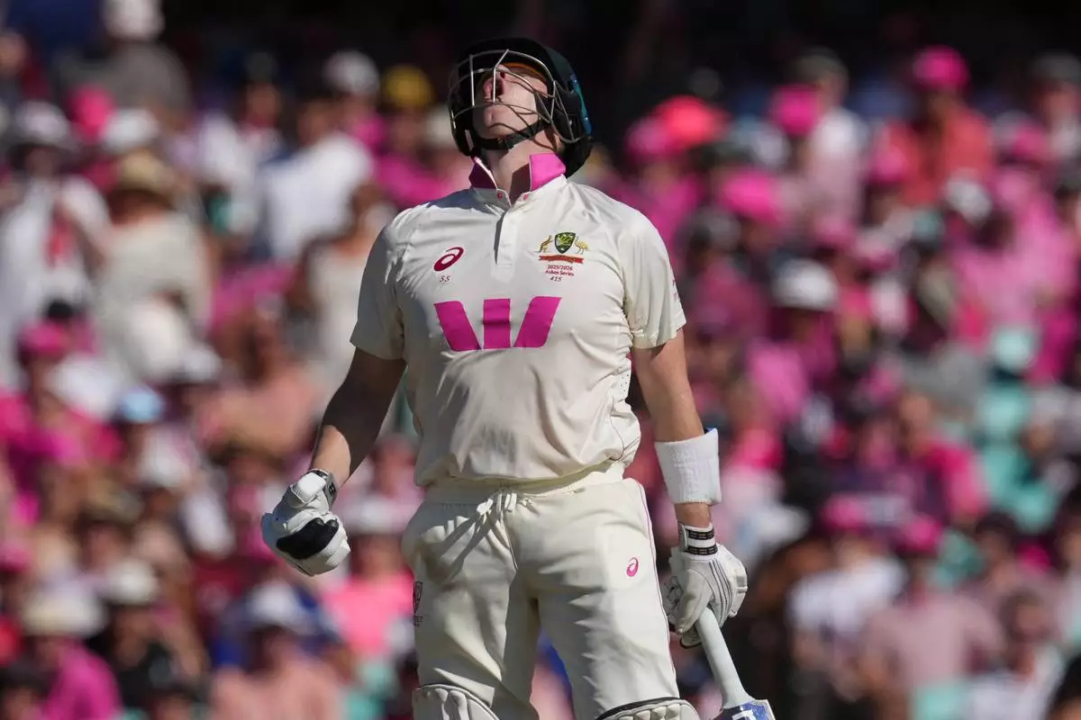 Australia's Steve Smith reacts during play on day three of the fifth and final Ashes cricket test between England and Australia in Sydney, Tuesday, Jan. 6, 2026. (AP Photo/Mark Baker)