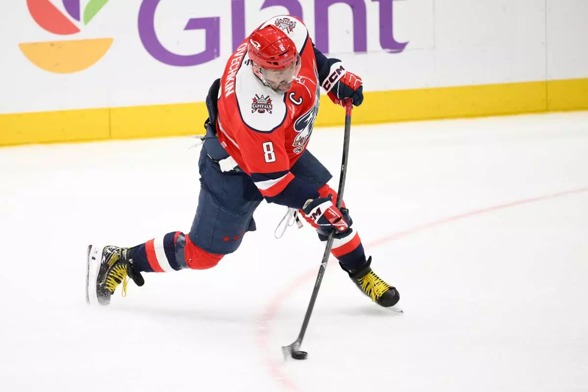 Washington Capitals left wing Alex Ovechkin shoots during the third period of an NHL hockey game against the Chicago Blackhawks, Saturday, Jan. 3, 2026, in Washington. (AP Photo/Nick Wass)