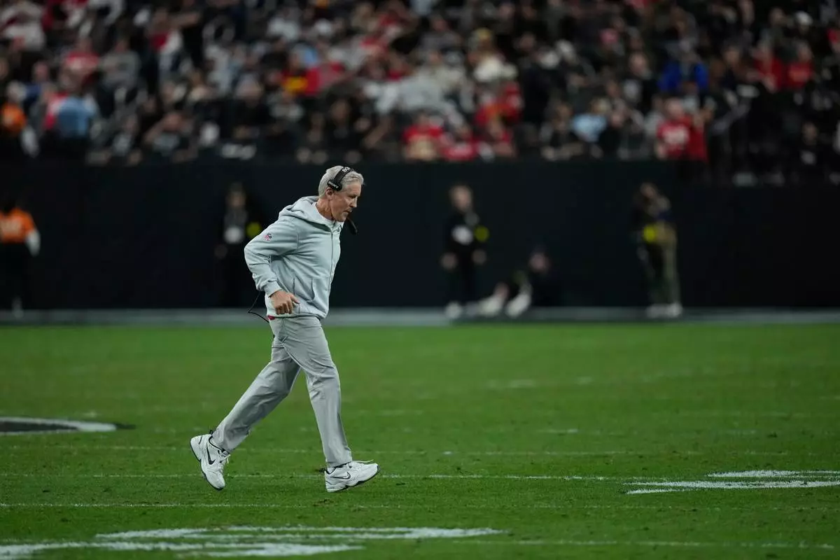 Las Vegas Raiders head coach Pete Carroll jogs on the field during timeout in the first half of an NFL football game against the Kansas City Chiefs Sunday, Jan. 4, 2026, in Las Vegas. (AP Photo/John Locher)