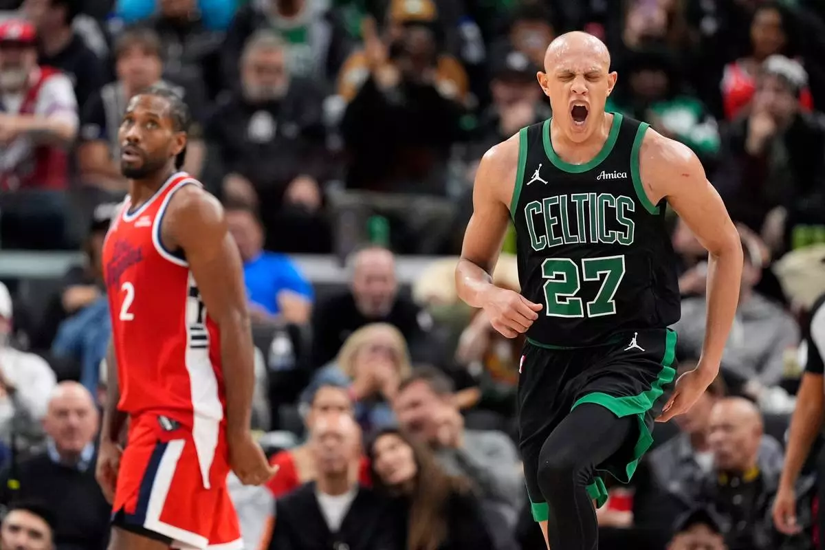 Boston Celtics guard Jordan Walsh, right, celebrates after scoring as Los Angeles Clippers forward Kawhi Leonard watches during the second half of an NBA basketball game Saturday, Jan. 3, 2026, in Inglewood, Calif. (AP Photo/Mark J. Terrill)