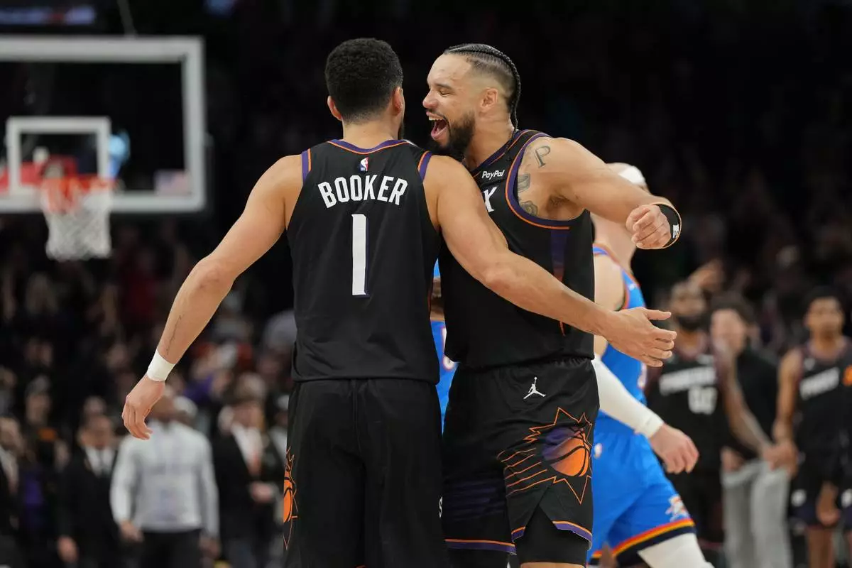 Phoenix Suns guard Devin Booker, left, celebrates with forward Dillon Brooks after hitting the winning shot against the Oklahoma City Thunder during the second half of an NBA basketball game, Sunday, Jan. 4, 2026, in Phoenix. (AP Photo/Rick Scuteri)