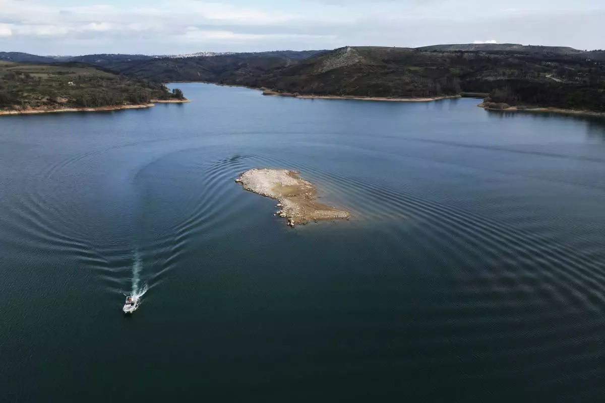 An islet that recently emerged is seen at Lake Marathon near Athens, Greece, on Tuesday, Jan. 6, 2026, as receding water levels reflect years of low rainfall. (AP Photo/Thanassis Stavrakis)