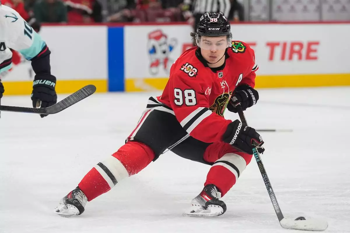 FILE - Chicago Blackhawks center Connor Bedard handles the puck during the second period of an NHL hockey game against the Seattle Kraken, Nov. 20, 2025, in Chicago. (AP Photo/Erin Hooley, File)