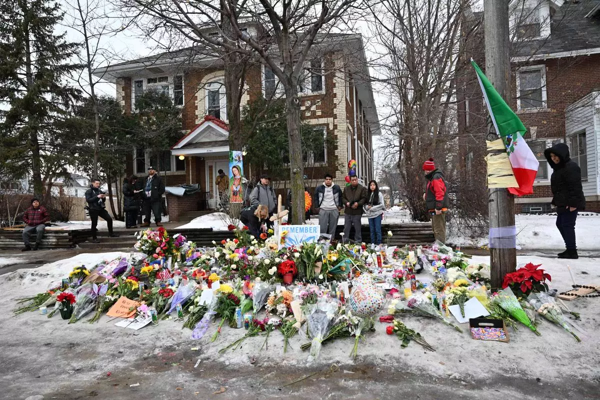 People gather around a makeshift memorial honoring Renee Good who was fatally shot by a federal law enforcement agent near the site of the shooting in Minneapolis, Thursday, Jan. 8, 2026. (AP Photo/Tom Baker)