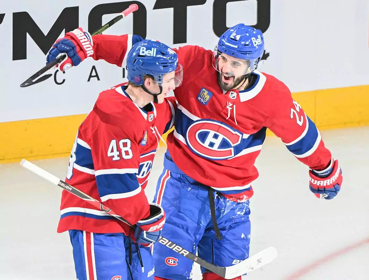 Montreal Canadiens' Lane Hutson (48) celebrates with teammate Phillip Danault (24) after scoring against the Calgary Flames during the second period of an NHL hockey game in Montreal, Wednesday, Jan. 7, 2026. (Graham Hughes/The Canadian Press via AP)
