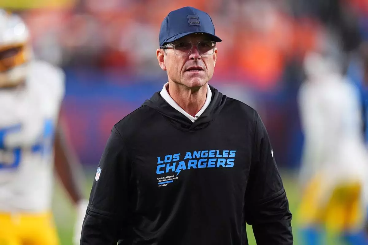 Los Angeles Chargers head coach Jim Harbaugh leaves the field after an NFL football game against the Denver Broncos Sunday, Jan. 4, 2026, in Denver. (AP Photo/David Zalubowski)