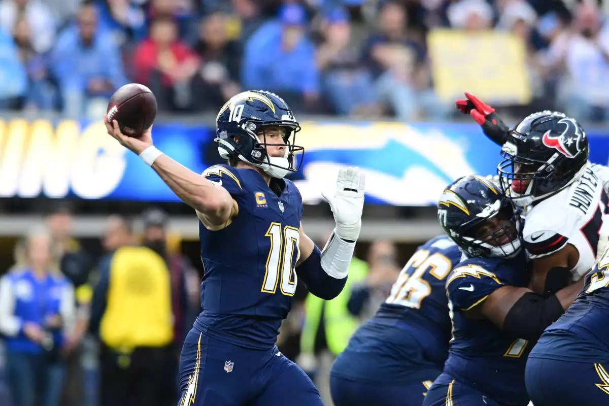 Los Angeles Chargers quarterback Justin Herbert (10) throws a pass during the first half of an NFL football game against the Houston Texans Saturday, Dec. 27, 2025, in Inglewood, Calif. (AP Photo/Wally Skalij)