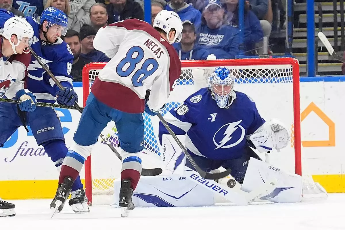 Tampa Bay Lightning goaltender Andrei Vasilevskiy (88) makes a save on a shot by Colorado Avalanche center Martin Necas (88) during the second period of an NHL hockey game Tuesday, Jan. 6, 2026, in Tampa, Fla. (AP Photo/Chris O'Meara)