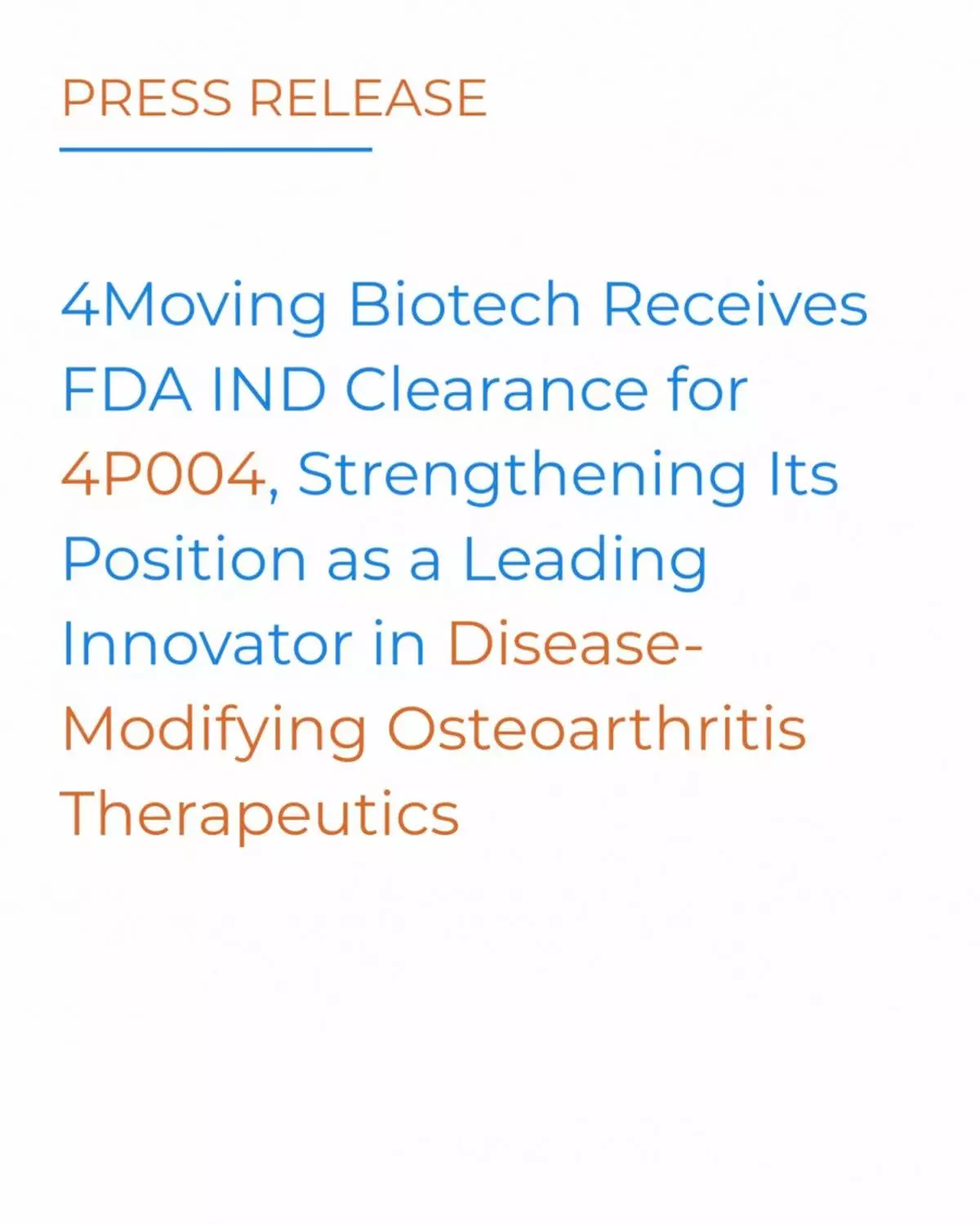 Professor Francis Berenbaum, MD, PhD, Chief Medical Officer of 4MovingBiotech, concluded: “The regulatory progress across three major regions underscores the scientific robustness of 4P004. INFLAM MOTION is designed to deliver clinically meaningful pain improvement while generating high-resolution structural and biological data to guide the next stage of development. We believe 4P004 has the potential to redefine how osteoarthritis is treated.”