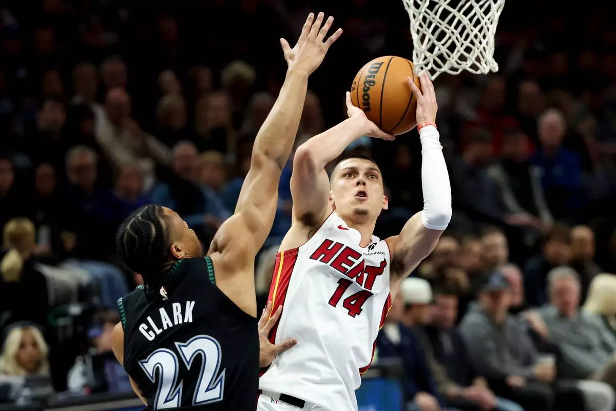 Miami Heat guard Tyler Herro (14) shoots against Minnesota Timberwolves guard Jaylen Clark (22) during the first half of an NBA basketball game, Tuesday, Jan. 6, 2026, in Minneapolis. (AP Photo/Ellen Schmidt)