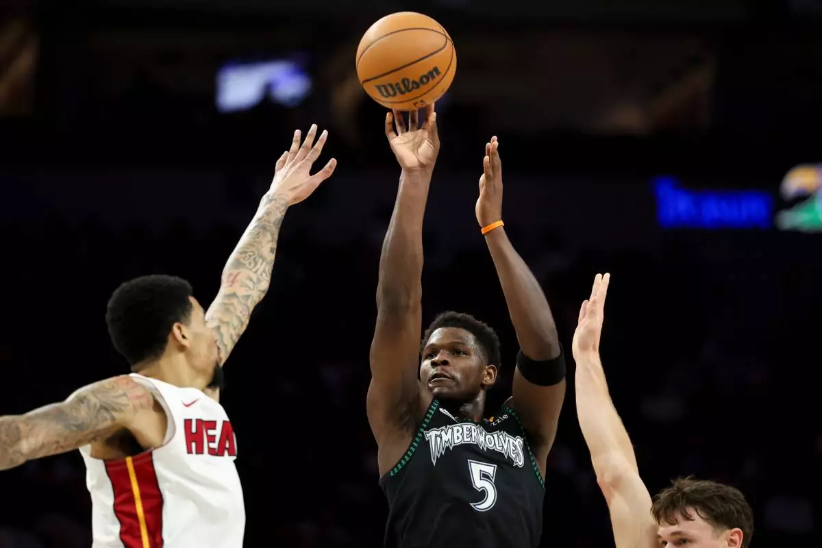 Minnesota Timberwolves guard Anthony Edwards (5) shoots between Miami Heat center Kel'el Ware, left, and guard Pelle Larsson, right, during the first half of an NBA basketball game, Tuesday, Jan. 6, 2026, in Minneapolis. (AP Photo/Ellen Schmidt)