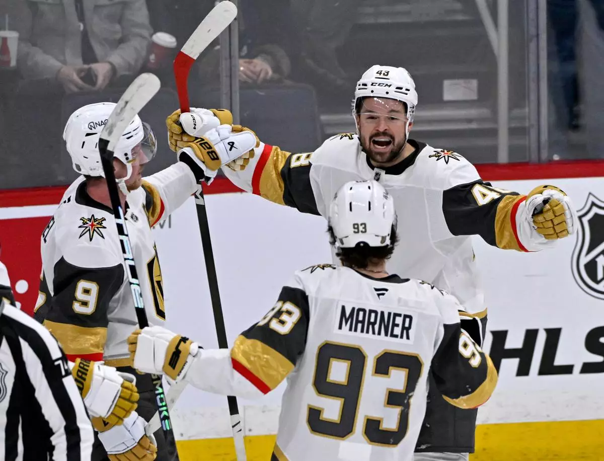 Vegas Golden Knights' Tomas Hertl (48) celebrates his game-winning goal against the Winnipeg Jets with Mitch Marner (93) and Jack Eichel (9) in overtime of their NHL hockey game in Winnipeg, Tuesday Jan. 6, 2026. (Fred Greenslade/The Canadian Press via AP)