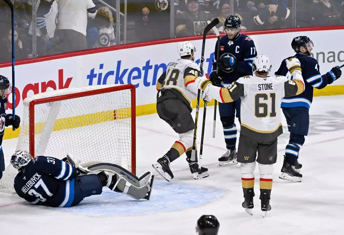 WINNIPEG, Manitoba (AP) — Tomas Hertl scored on the power play at 4:47 of overtime and the Vegas Golden Knights beat Winnipeg 4-3 on Tuesday night, handing the Jets their 10th straight loss.