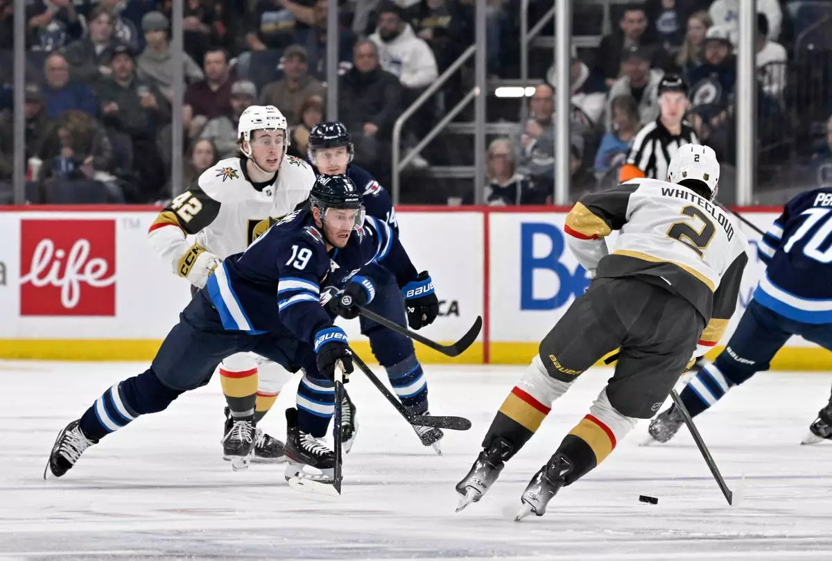 Vegas Golden Knights' Zach Whitecloud (2) passes the puck past Winnipeg Jets' Jonathan Toews (19) during the second period of an NHL hockey game in Winnipeg, Manitoba, Tuesday, Jan. 6, 2026. (Fred Greenslade/The Canadian Press via AP)