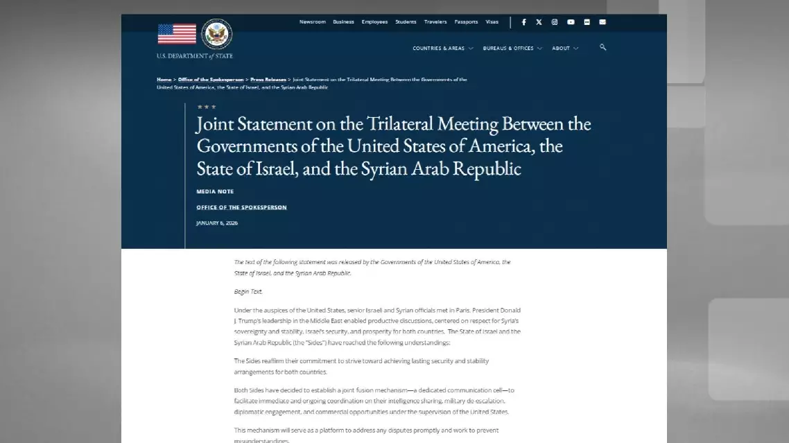 The U.S. Department of State issued on Tuesday a joint statement on the trilateral meeting between the U.S., Israel and Syria on security arrangement after conclusion of the meeting in Paris.