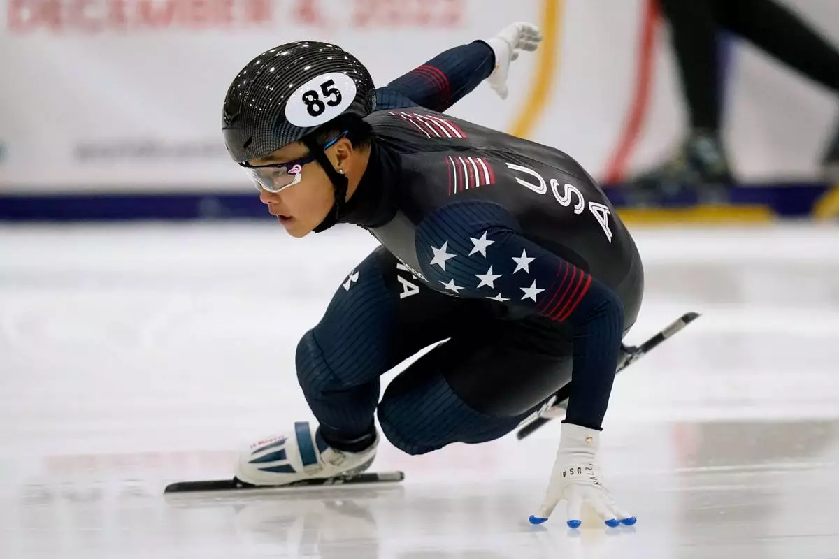 FILE - The United States' Andrew Heo skates during the semi-final of the men's 500 meters at the Four Continents Championship short track speedskating event Friday, Nov. 11, 2022, in Kearns, Utah. (AP Photo/Rick Bowmer, File)