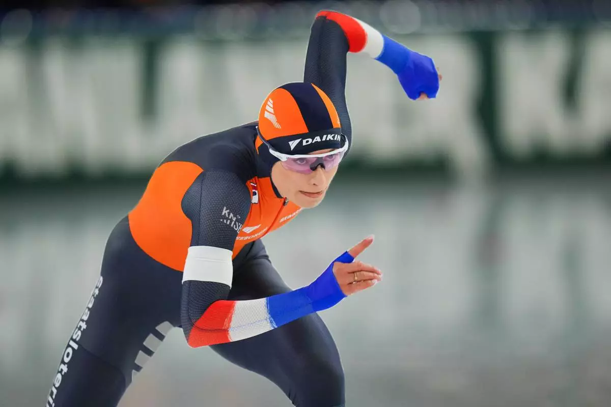FILE - Femke Kok of the Netherlands in action during a 500 meter race of the World Cup Speedskating at the Thialf ice arena in Heerenveen, northern Netherlands, Friday, Feb. 28, 2025. (AP Photo/Peter Dejong, File)