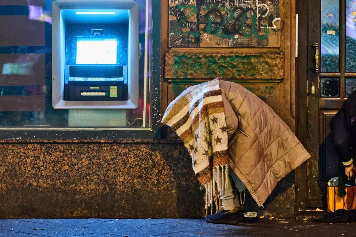 A woman covers herself with a blanket against the cold next to a banking machine in Frankfurt, Germany, Wednesday, Jan. 7, 2026. (AP Photo/Michael Probst)
