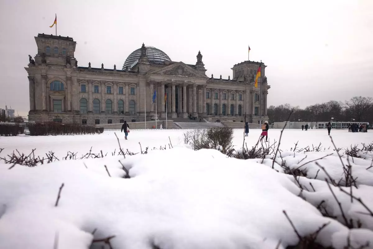 People walk in front of the Reichstag Building, home of the German parliament Bundestag, on a snowy winter day in Berlin, Germany, Thursday, Jan. 8, 2026. (AP Photo/Markus Schreiber)