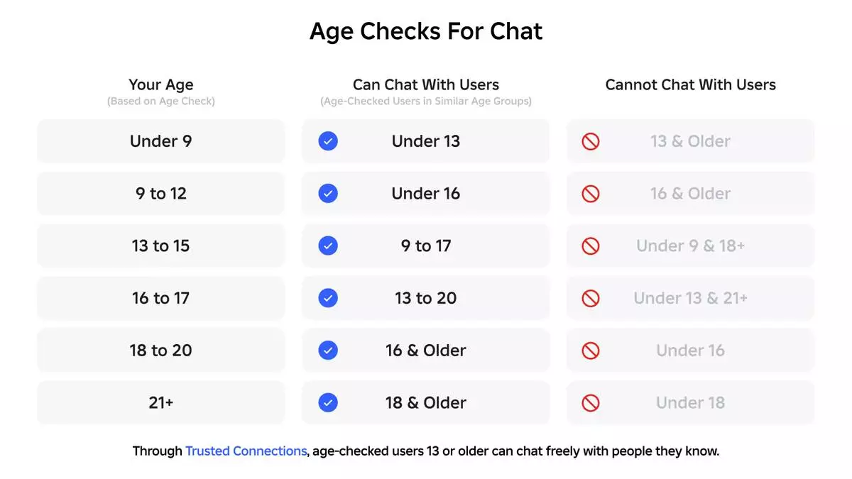 Once users complete an age check, they are assigned to one of six age groups: under 9, 9–12, 13–15, 16–17, 18–20, and 21+. By default, users in each age group can chat with users in the groups directly above and below theirs (i.e., users 9-12 can chat with users in their own group, as well as those in the under 9 and 13-15 groups.)