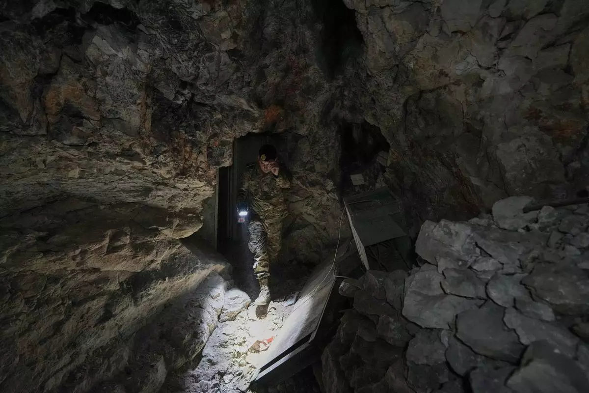 FILE — A Lebanese army soldier walks through a tunnel dug into a mountain that was used by Hezbollah militants as a clinic and storage facility near the Lebanese-Israeli border in the Zibqin Valley, southern Lebanon, Friday, Nov. 28, 2025. (AP Photo/Bilal Hussein, File)
