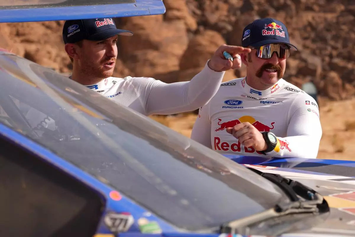Driver Mitch Guthrie, left, and co-driver Kellon Walch talk after the fourth stage of the Dakar Rally between Alula and Hail, Saudi Arabia, Wednesday, Jan. 7, 2026. (AP Photo/Thibault Camus)