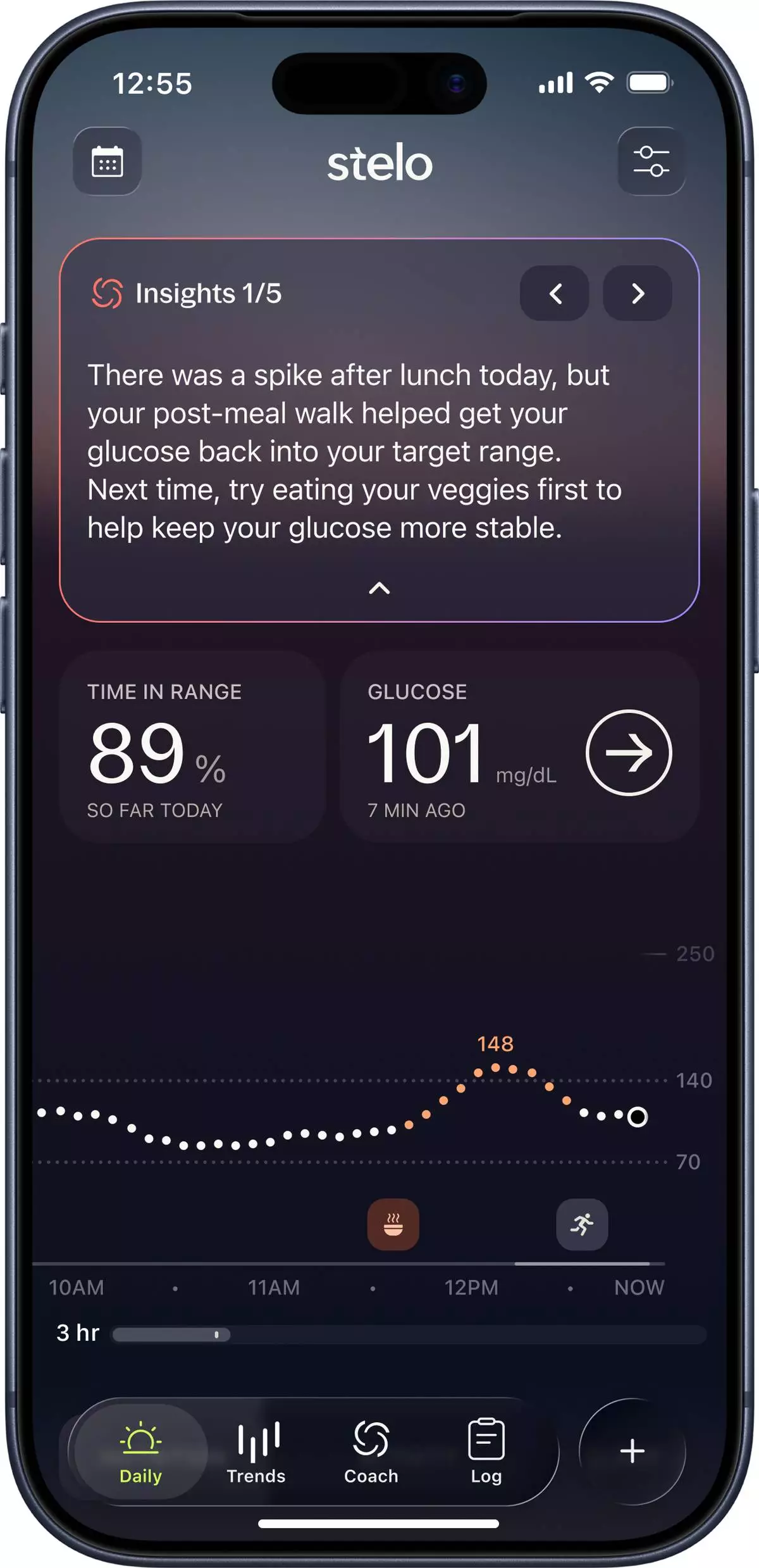 The daily tab highlights a user’s current and recent glucose readings, their time in range, logged events and insights.