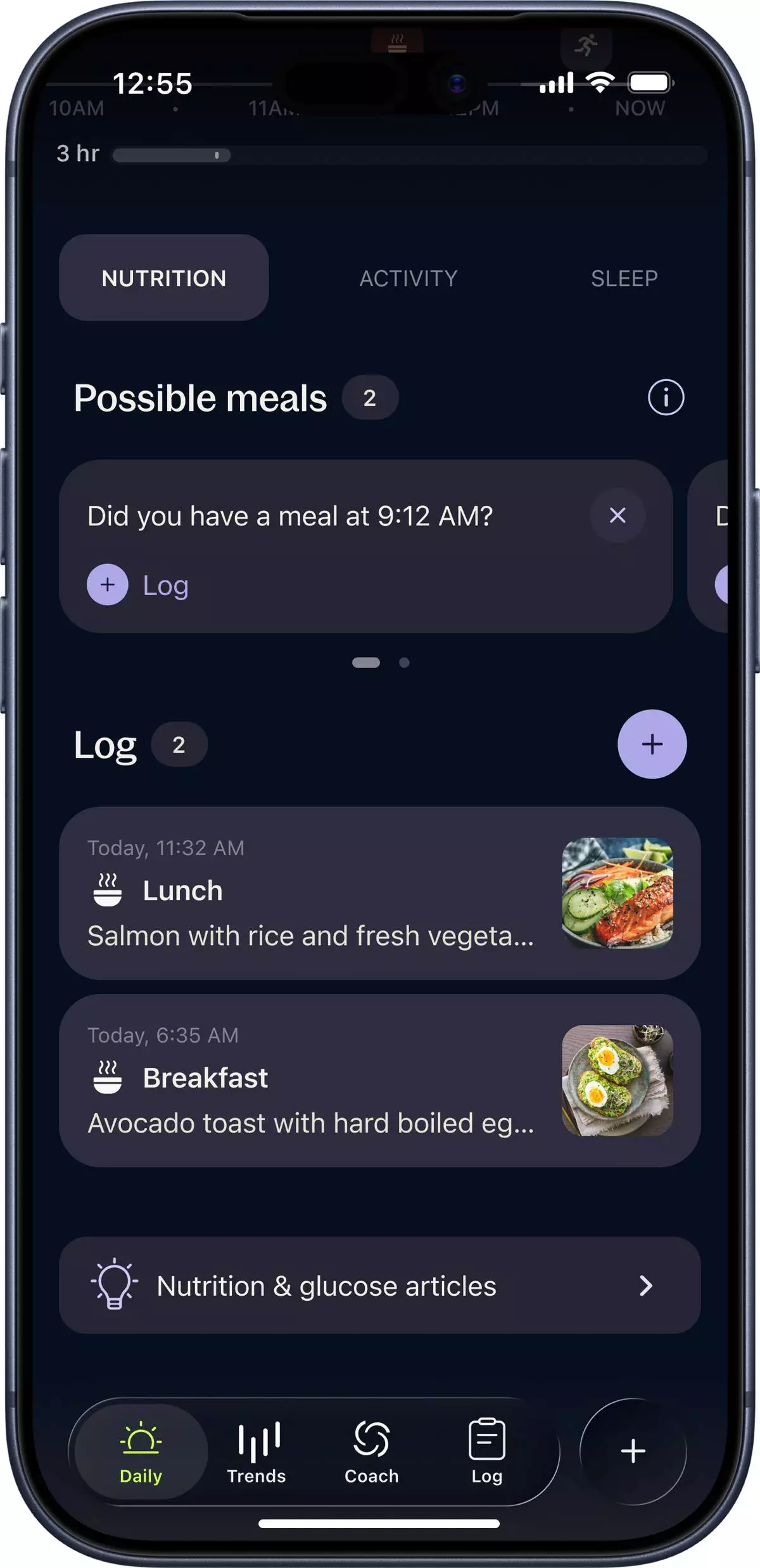 The nutrition section gives quick access to recent meal information.