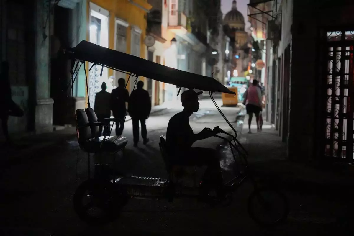 A bicycle taxi traverses a road at night in Havana, Tuesday, Jan. 6, 2026. (AP Photo/Ramon Espinosa)