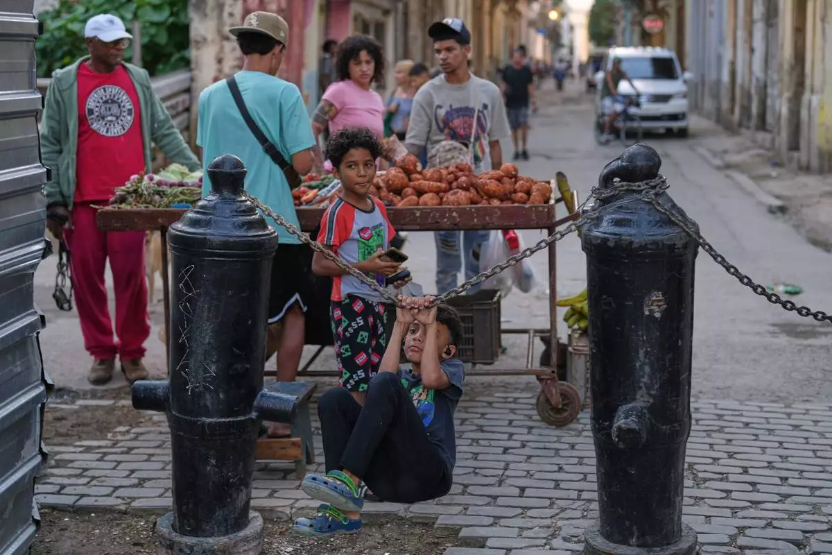 A child hangs on chains while customers shop at a street stall in Old Havana, Monday, January 5, 2026. (AP Photo/Ramon Espinosa)