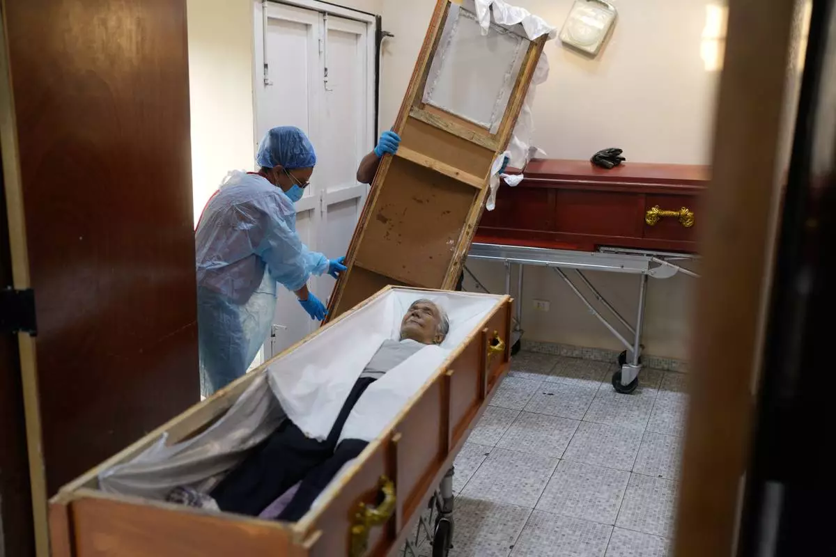 Funeral workers prepare the body of Rosa Elena Gonzalez, 80, who died after her apartment was hit during a U.S. strike to capture President Nicolas Maduro, in Catia La Mar, Venezuela, Sunday, Jan. 4, 2026. (AP Photo/Matias Delacroix)