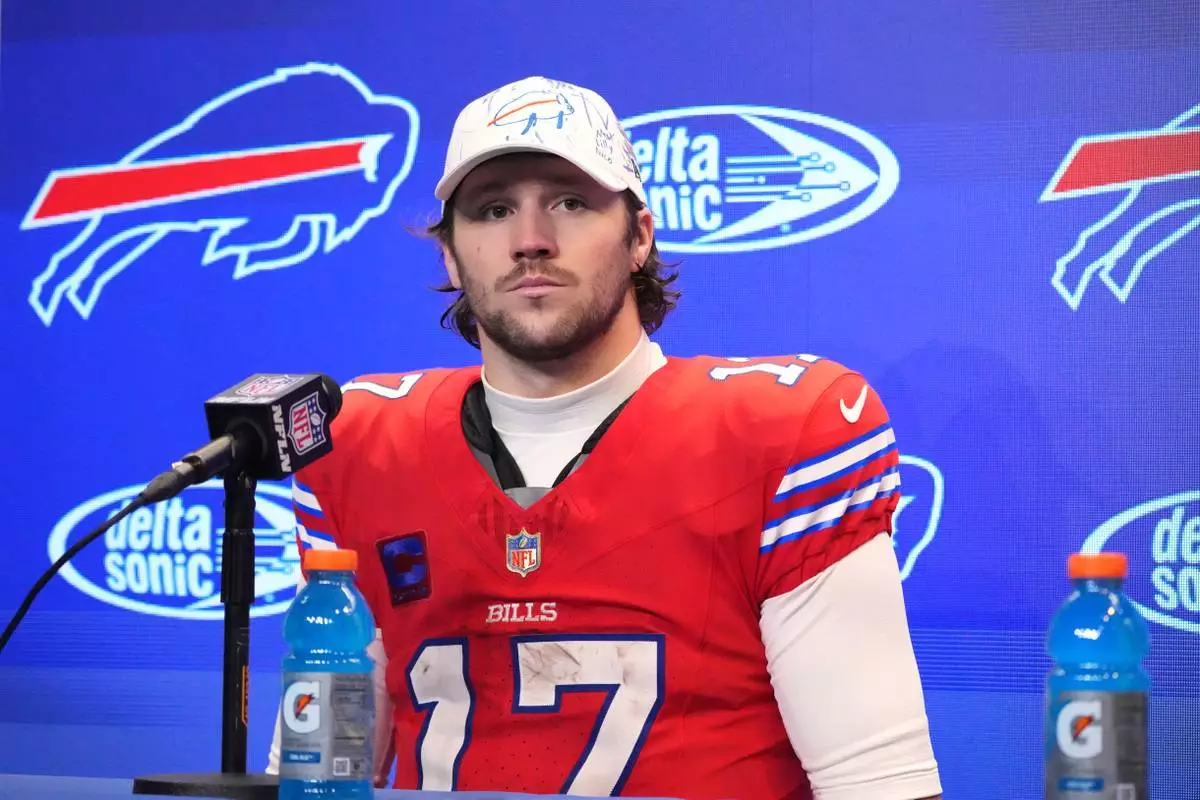 Buffalo Bills' Josh Allen pauses during a news conference after an NFL football game against the Philadelphia Eagles, Sunday, Dec. 28, 2025, in Buffalo, N.Y. (AP Photo/Gene J. Puskar)