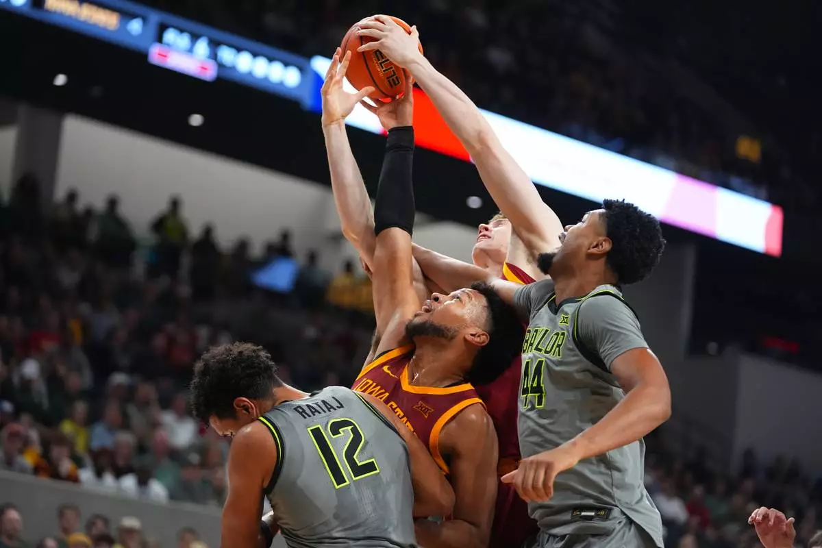 Baylor guard Michael Rataj (12) and center Caden Powell (44) compete for a rebound against Iowa State forward Joshua Jefferson, center, left, and forward Dominykas Pleta during the first half of an NCAA college basketball game Wednesday, Jan. 7, 2026, in Waco, Texas. (AP Photo/Julio Cortez)