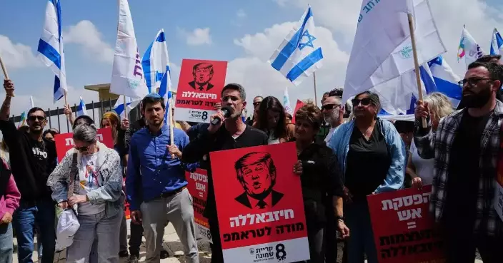 Residents of northern Israel living near the Lebanese border protest the security situation, outside the U.S. Embassy in Jerusalem Sunday, April 19, 2026. Hebrew on a sign bearing an image of President Trump reads "Hezbollah thanks Trump." (AP Photo/Mahmoud Illean)
