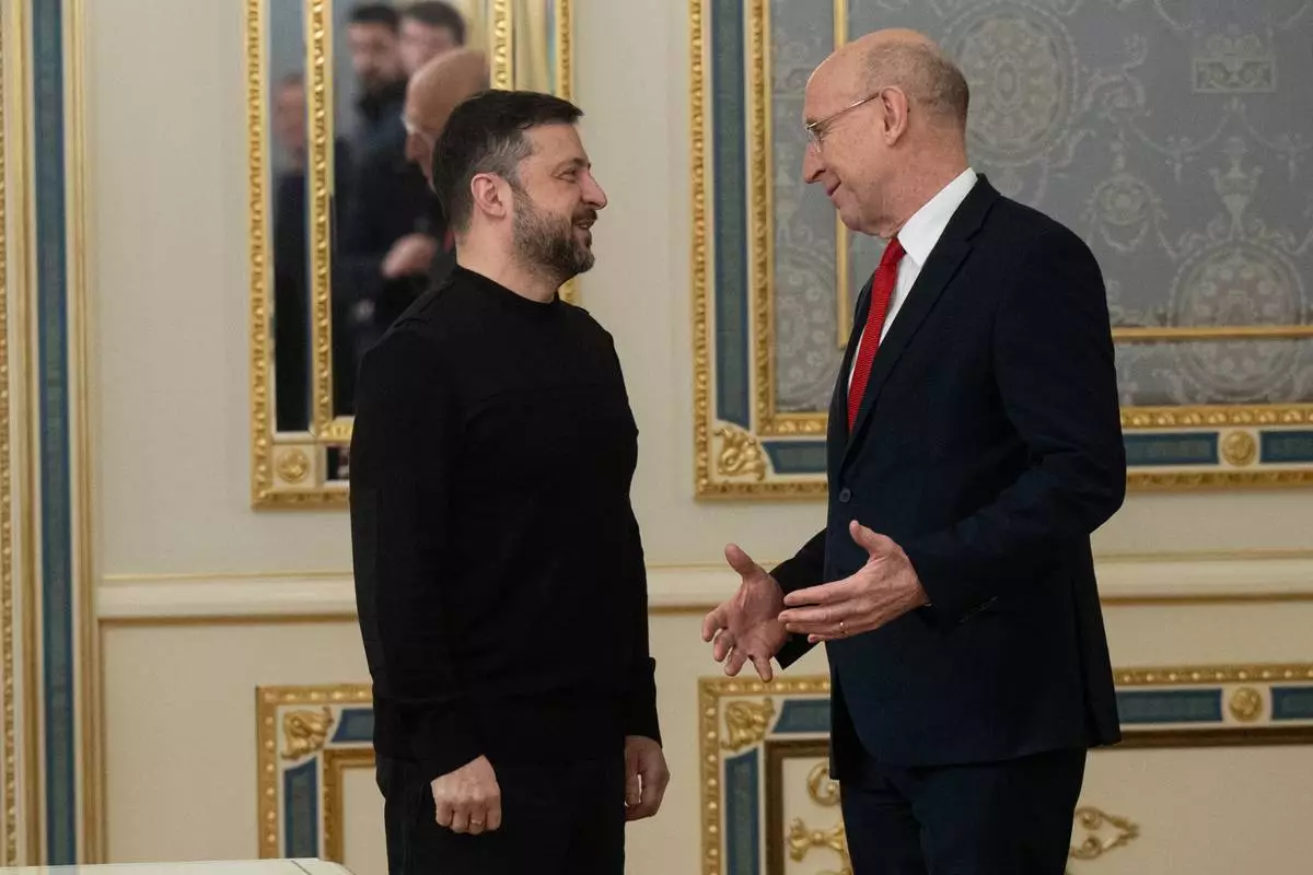 President of Ukraine Volodymyr Zelenskyy, left, and British Defense Secretary John Healey talk in Kyiv, Ukraine, Friday, Jan. 9, 2026. (AP Photo/Danylo Antoniuk)