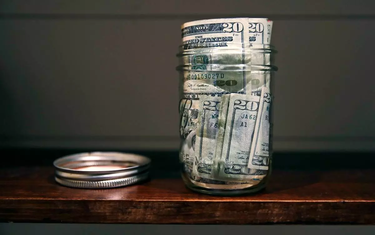 FILE - A canning jar filled with money sits on a shelf in East Derry, N.H., June 15, 2018. (AP Photo/Charles Krupa, File)