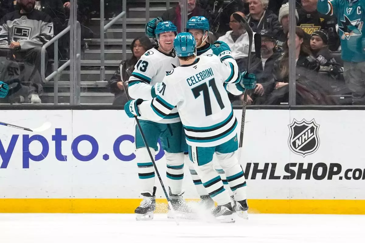 San Jose Sharks center Tyler Toffoli, left, celebrates his goal with center MacKlin Celebrini, center and center Alexander Wennberg during the second period of an NHL hockey game against the Los Angeles Kings, Wednesday, Jan. 7, 2026, in Los Angeles. (AP Photo/Mark J. Terrill)