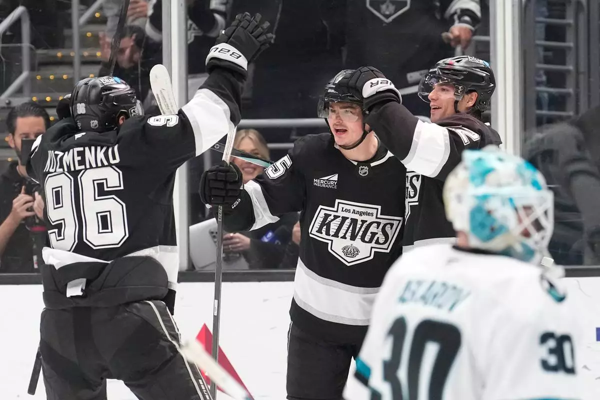 Los Angeles Kings center Alex Turcotte, second from left, cele braces his goal with left wing Andrei Kuzmenko, left, and left wing Kevin Fiala, second from right, as San Jose Sharks goaltender Yaroslav Askarov sits inn goal during the second period of an NHL hockey game Wednesday, Jan. 7, 2026, in Los Angeles. (AP Photo/Mark J. Terrill)