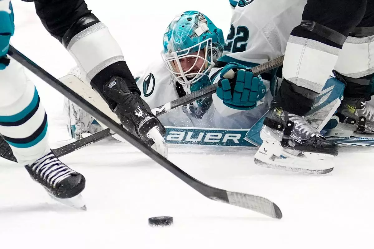 San Jose Sharks goaltender Yaroslav Askarov dives in front of the puck during the second period of an NHL hockey game against the Los Angeles Kings, Wednesday, Jan. 7, 2026, in Los Angeles. (AP Photo/Mark J. Terrill)