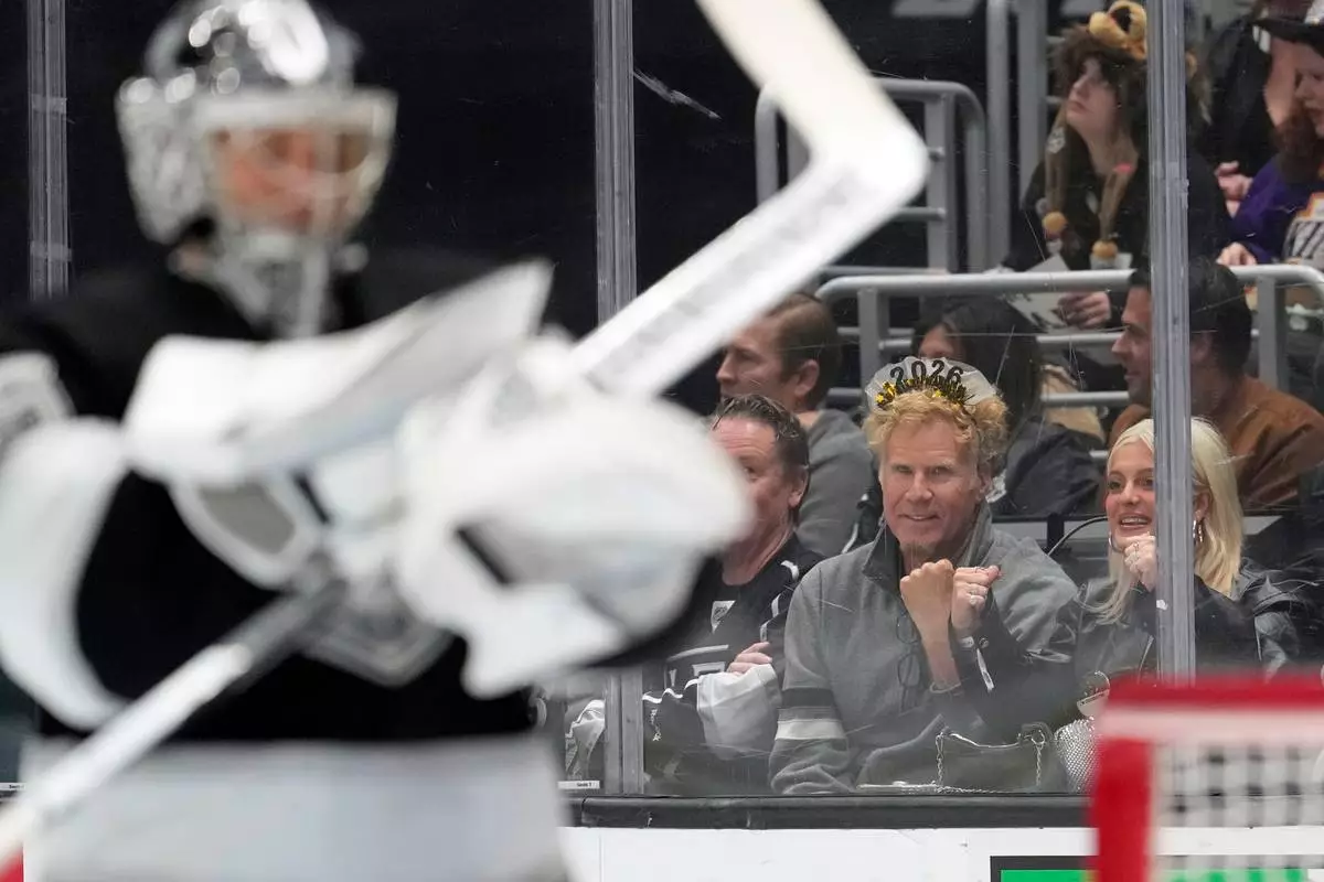 Actor Will Ferrell, center, watches as Los Angeles Kings goaltender Darcy Kuemper stands in goal during the first period of an NHL hockey game against the San Jose Sharks, Wednesday, Jan. 7, 2026, in Los Angeles. (AP Photo/Mark J. Terrill)