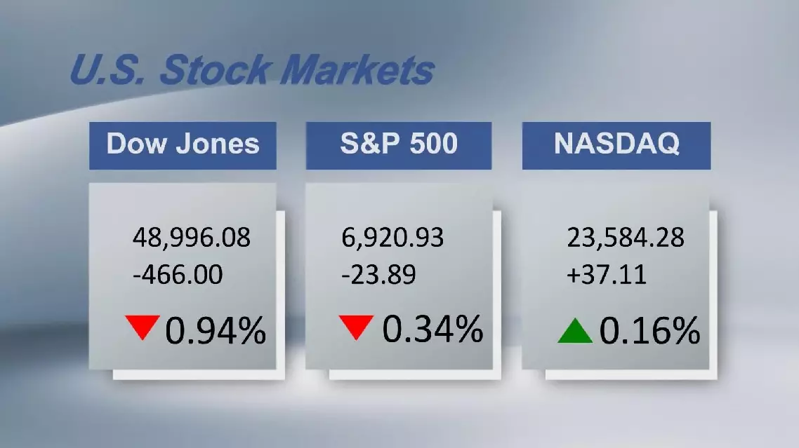 The Dow Jones Industrial Average dropped 0.94 percent to 48,996.08. The S and P 500 fell 0.34 percent to 6,920.93. The Nasdaq Composite Index edged up 0.16 percent to 23,584.28.