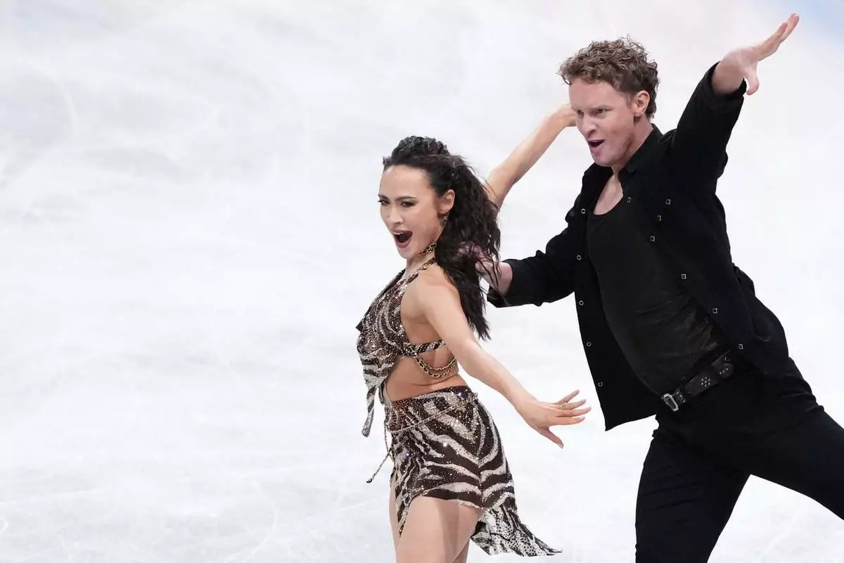FILE - Madison Chock and Evan Bates, of the United States, compete in the ice dance's rhythm dance segment at the ISU Grand Prix of Figure Skating Final in Nagoya, central Japan, Thursday, Dec. 4, 2025. (AP Photo/Hiro Komae, File)