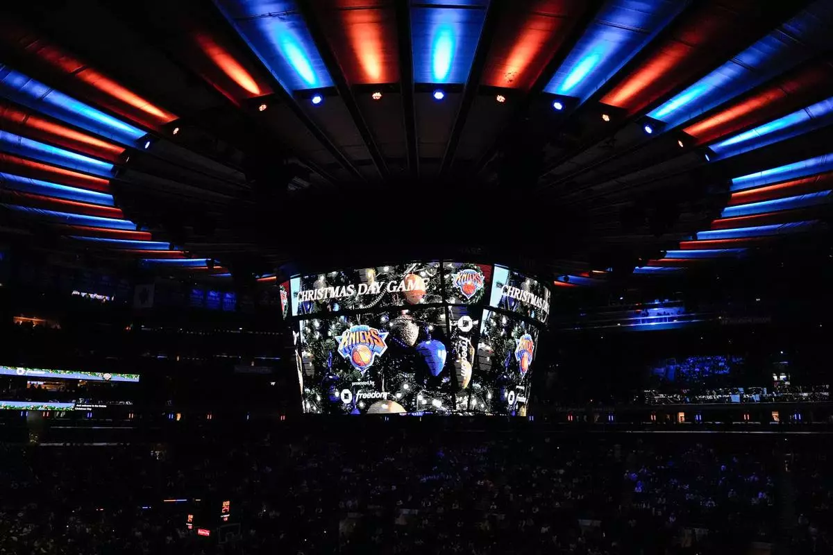 A screen displays "Christmas Day Game" before an NBA basketball game between the New York Knicks and the Cleveland Cavaliers, Thursday, Dec. 25, 2025, in New York. (AP Photo/Yuki Iwamura)